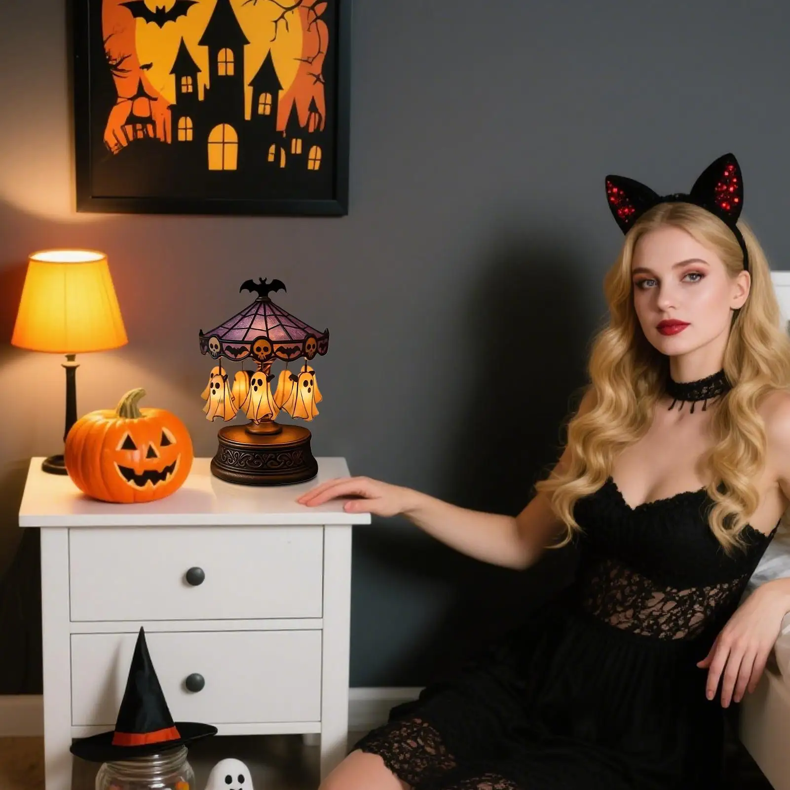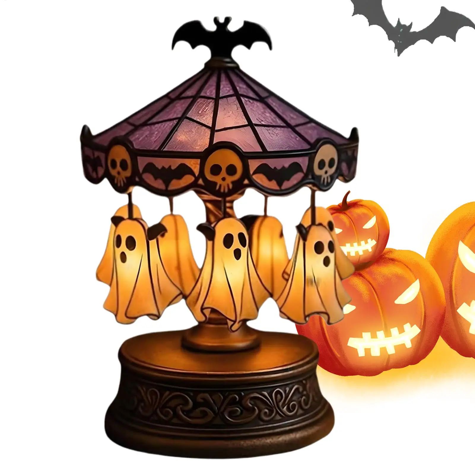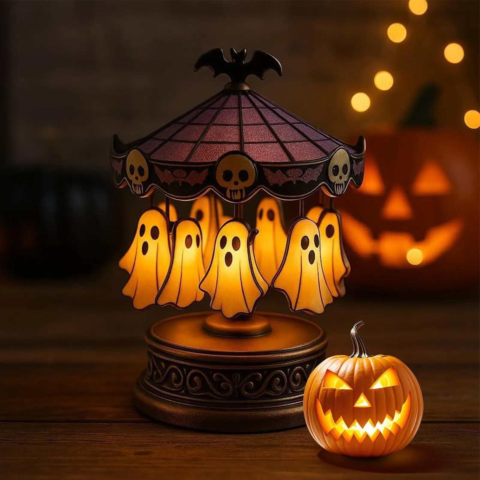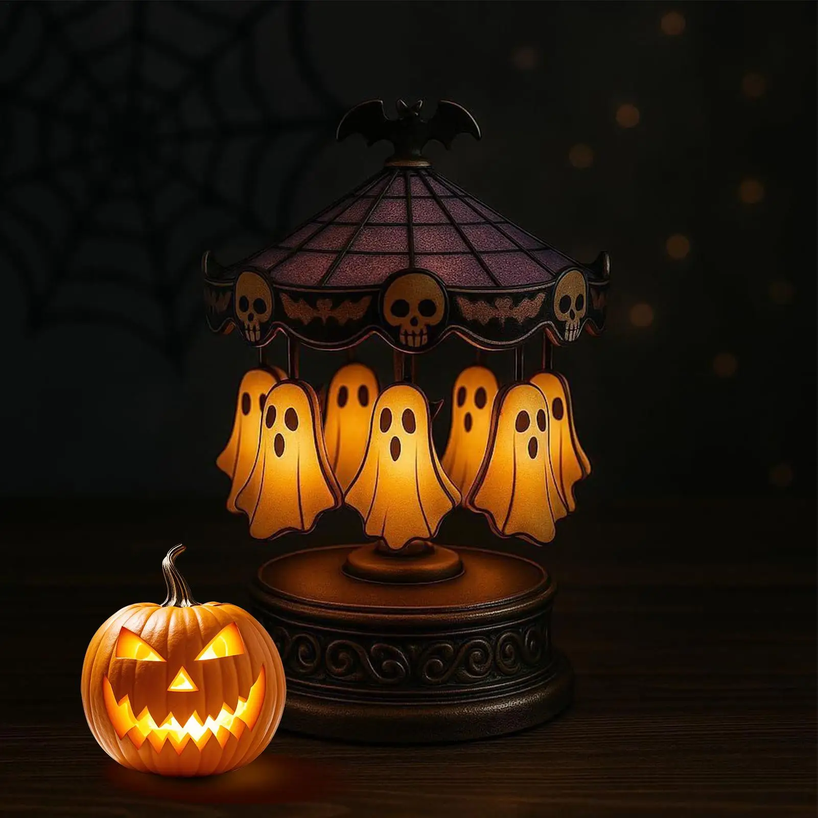 3.Authentic Halloween Display: Featuring ghost figurines in a carousel design, this decorative element captures the feel of Halloween with festive feel, creating captivating scenes and doubling as a shareable photo backdrop