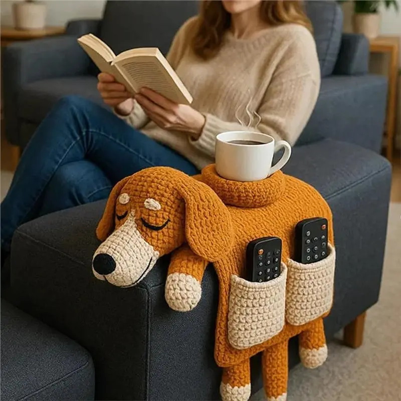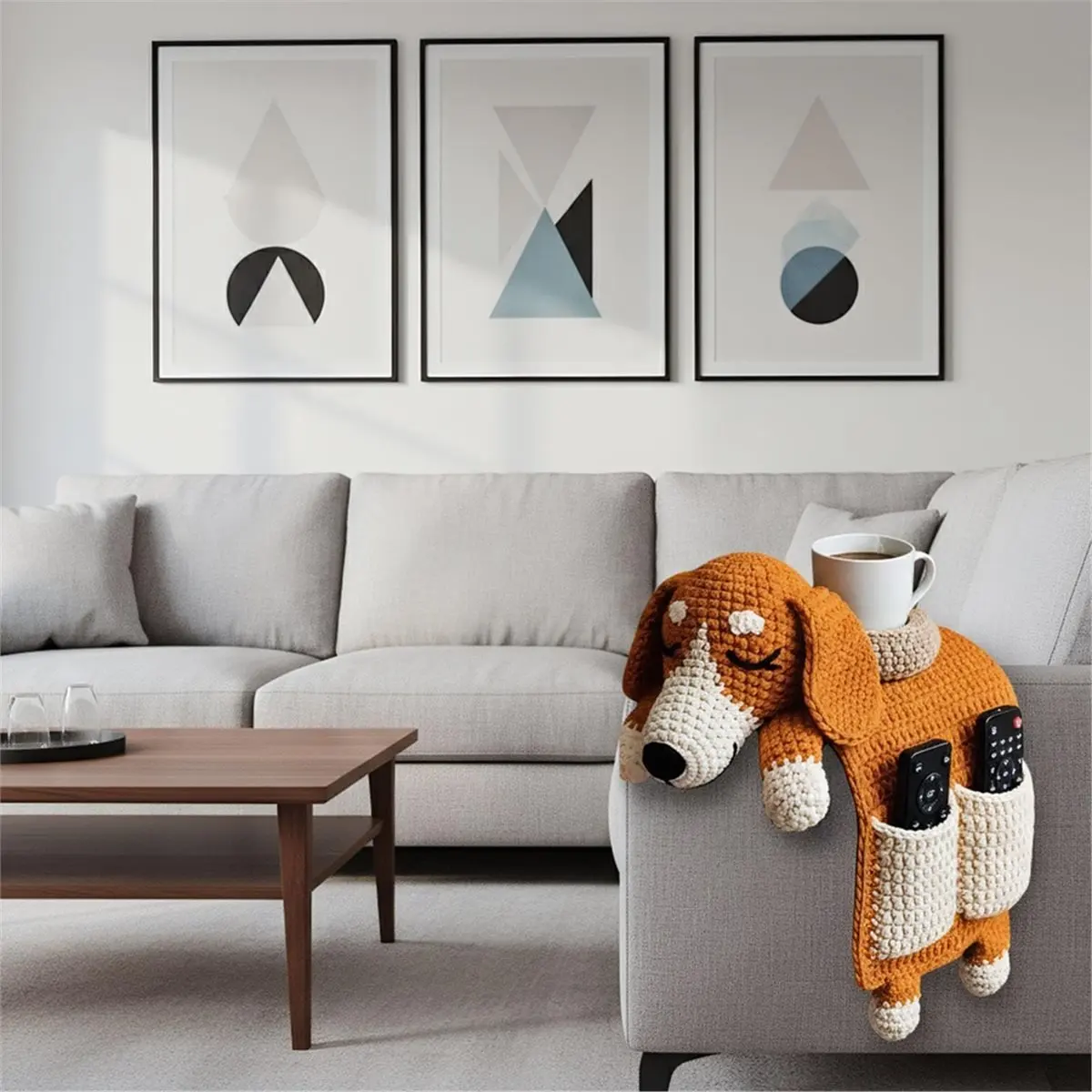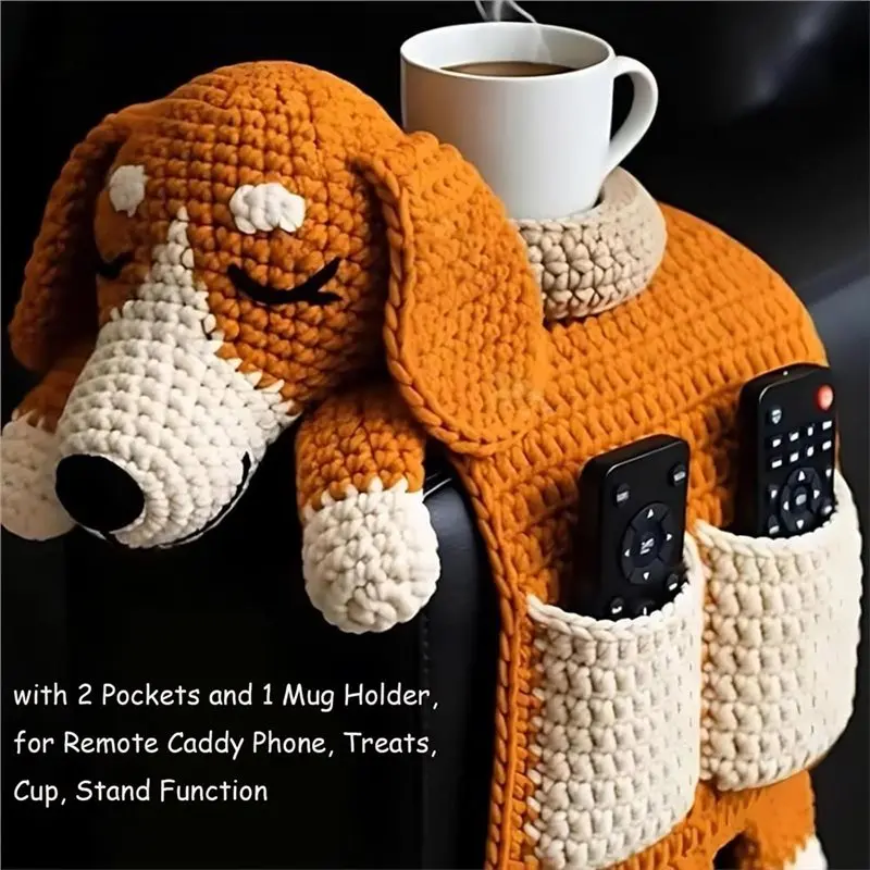 Charming Crochet Dog Sofa Organizer: This crochet cat sofa arm organizer is hand-crocheted to resemble a sleepy puppy, adding a cozy and playful touch to your living room decor, tidies up clutter while preventing spills during relaxing.
